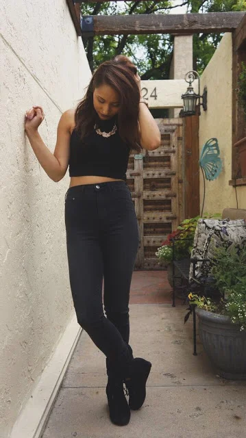 Sometimes during the summer, I am in anarchy. I don't want to wear shorts. I've had enough of peeling myself off of chairs and car seats because my upper thighs have become sweat-glued to them. I've had enough of fun and bright summer colors. I want the fall. So this outfit is an ode to the crisp and cool weather and to the days where 70 degrees is just enough. While this particular day was still hot, the overcast provided a nice reminder that my favorite season is indeed, just around the corner. Still maintaining some spirit of summer, I wore a black crop-top recently purchased at H&M. The dark gray high-waisted jeans and the statement necklace also found themselves in my shopping bag on the same trip, making the purchase about $40. I'm basically free marketing for the fall H&M line.