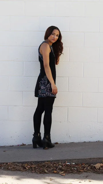 The dress is from Urban Outfitters and has a very lovely and simple floral design. It also has a cut-out in the back, which I adore. I dressed it up with a long layered necklace from Aldo, tights because I'm not crazy it's still practically winter, and my favorite black boots from Express. I call it sophistication with a little edge. You can play it up or play it down, and that's why I'm going to be wearing this thing almost every time I step out of the house, you know, when my Internet blocks me from Netflix.